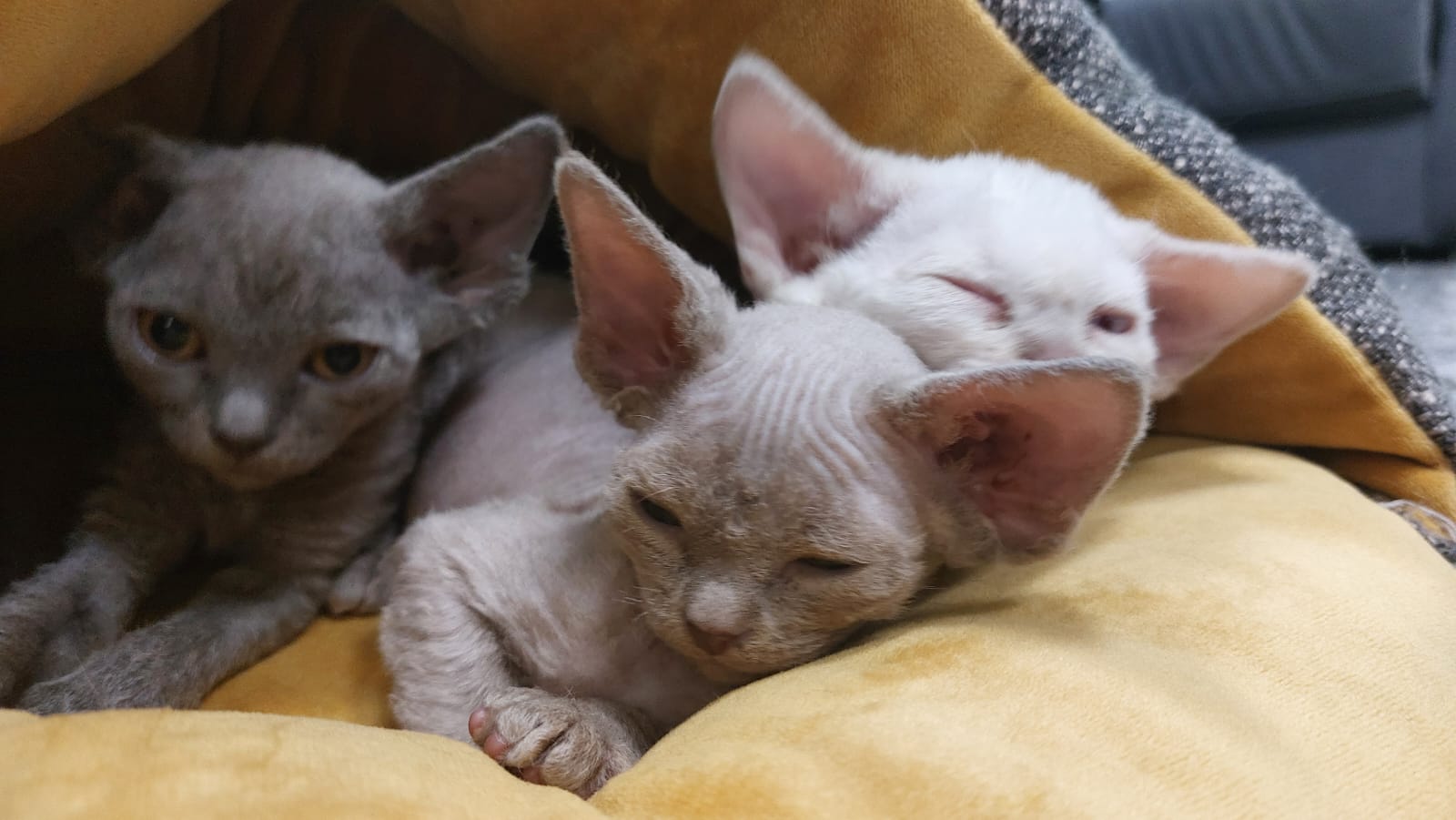 - Psy: Devon Rexy bardzo często tworzą silne relacje z psami. Dlaczego? Są pewne siebie, nie boją się ruchu i dźwięków, lubią wspólną zabawę, nie uciekają w panice (a to zmniejsza reakcję pogoni u psa), są komunikatywne i elastyczne w kontakcie. Zarówno małe rasy (maltańczyki, shih tzu, yorki), jak i duże (owczarki, labradory, husky) potrafią się dogadać z Devonami – wiemy to też z naszego doświadczenia.