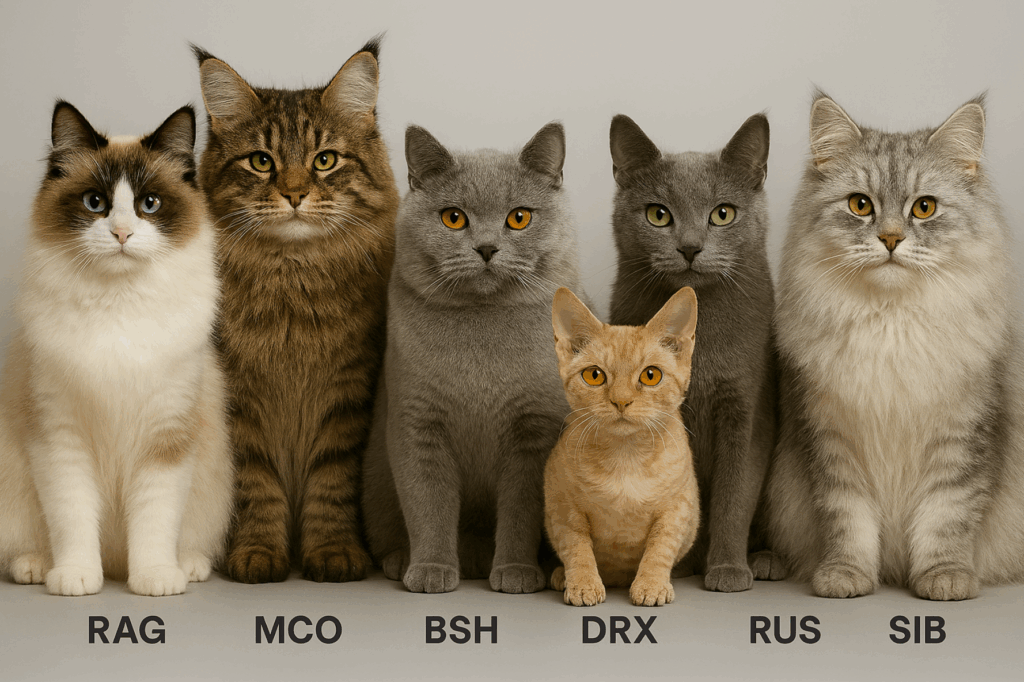 * Dane na podstawie statystyk Federacji Felinologicznej FPL za lata 2006-2025. Liczba kociąt zarejestrowanych (wydanych rodowodów kociąt) w latach 2025+2024: RAG – 5052+6717, MCO – 4388+6424, BSH – 3469+4931, DRX – 1389+1966, RUS – 713+973, SIB – 556+729