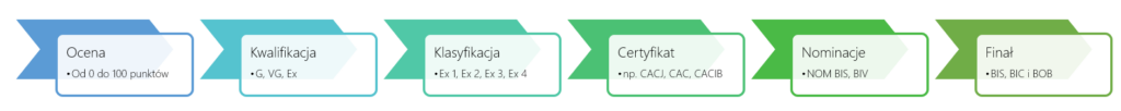 Każdy kot na wystawie jest oceniany i sposób oceny ma swój pewien charakterystyczny przebieg. Szczegóły opiszemy za chwilę, ale najpierw popatrzcie na ten mały schemat (nie przejmujcie się dziwnymi nazwami i skrótami, zaraz je wyjaśnimy).