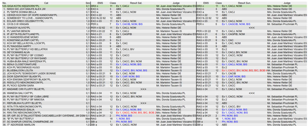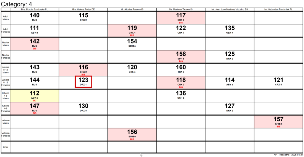 Przykład: Poniżej przykład ocen w kategorii 4 (gdzie są m.in. Devon Rexy), gdzie na wystawie w Piasecznie nasza GIGA otrzymała nominację (NOM), a następnie wystąpiła w części finałowej BIS. Mieliśmy w katalogu wystawy numer 123 (i tak jest to prezentowane na monitorach). I jak możecie zobaczyć w poziomej linii – startowała w grupie/klasie Juniors (8-12) Females. Konkurowała tam z kotem rosyjskim niebieskim (144), dwoma Cornish Rexami (118 oraz 131) i Abisyńczykiem (114). Finalnie BIS w naszej klasie wygrał Cornish z numerem 118 (podświetlony na różowo i z dopiskiem BIS), a najlepszym kotem całej kategorii 4 (czyli nie tylko z linii poziomej, ale całej tabeli) został Abisyńczyk z numerem 112 (podświetlony na żółto i z dopiskiem BIC). Ten Abisyńczyk finalnie zdobył też nagrodę BOB1, czyli był najlepszym kotem całej wystawy.