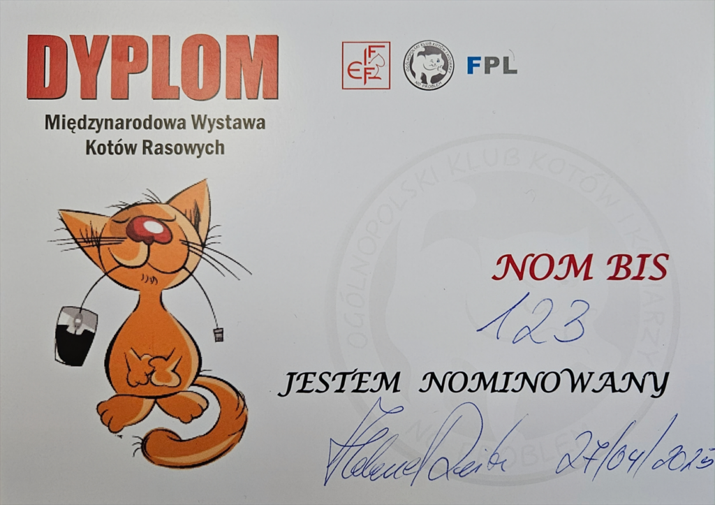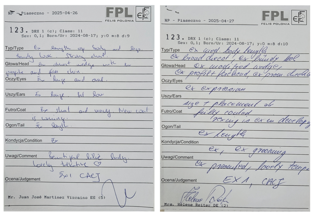 Przykład: Nasza GIGA w Piasecznie (kwiecień 2025) otrzymała jednego dnia Ex 1 od sędziego z Hiszpanii, oraz drugiego dnia, również Ex 1 od sędziny z Niemiec. Zobaczcie na poniższym zdjęciu jak wygląda protokół sędziowski po tej wystawie – opisany jest każdy element kota + opis/komentarz sędziego, oraz na koniec jest ocena – u nas 2x Ex 1 (każda w inny dzień wystawy i od innego sędziego).