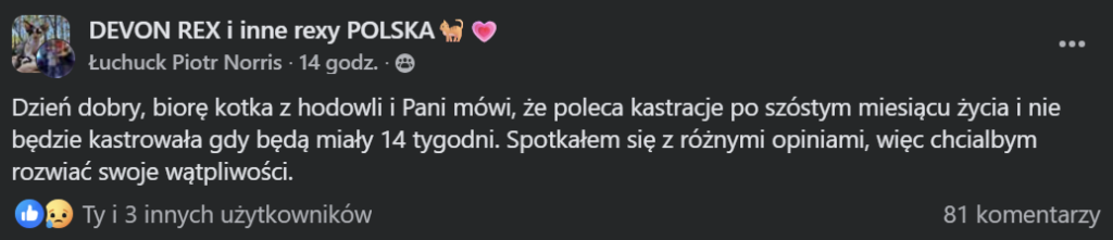 „Dzień dobry, biorę kotka z hodowli i Pani mówi, że poleca kastracje po szóstym miesiącu życia i nie będzie kastrowała gdy będą miały 14 tygodni. Spotkałem się z różnymi opiniami, więc chcialbym rozwiać swoje wątpliwości.”